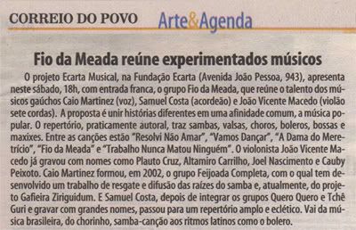 O projeto “Fio da meada” reúne o talento de quatro músicos gaúchos. A voz de “Caio Martinez”, o acordeon de “Samuel Costa”, o violão sete cordas de “João Vicente Macedo” e a percussão de “Fernando Sessé”.